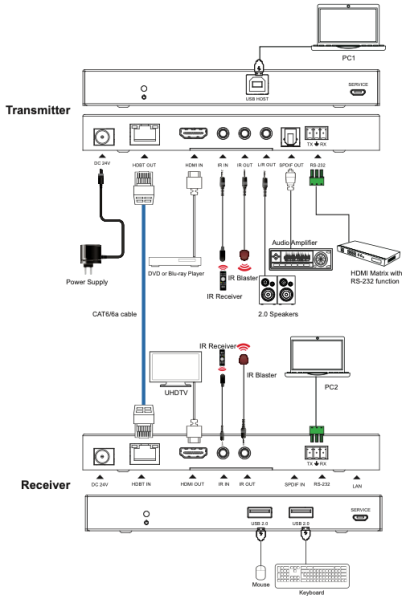 The transmitter supports local audio extraction, bi-directional IR pass-through for controlling both source and display devices. It also supports PoC (power over cable).